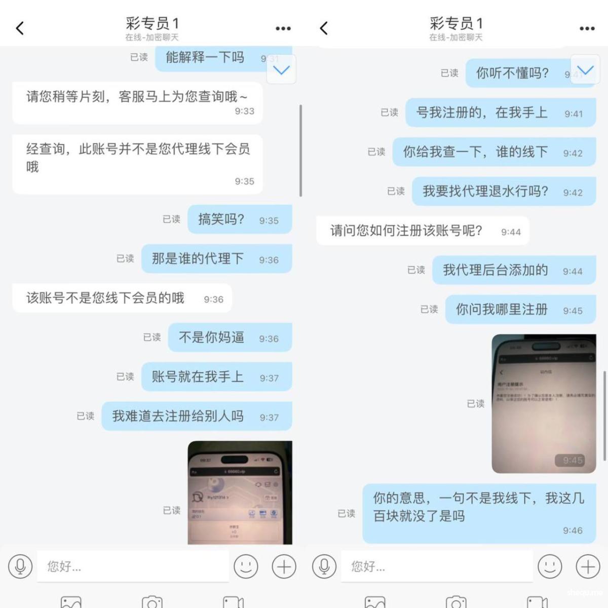我后台添加会员,设置退水、密码、密保、提款密码、绑定银行卡等操作,结果平台发现后就推说是我自己注册错了。会员记录明明显示新增会员,他们却狡辩说我注册错了。我要求提供上级联系方式,他们说没有。明明是他们自己的代理线,知道我要曝光后,就假装好心说要帮我查。使用聊天软件还搞自动清除聊天记录的把戏。