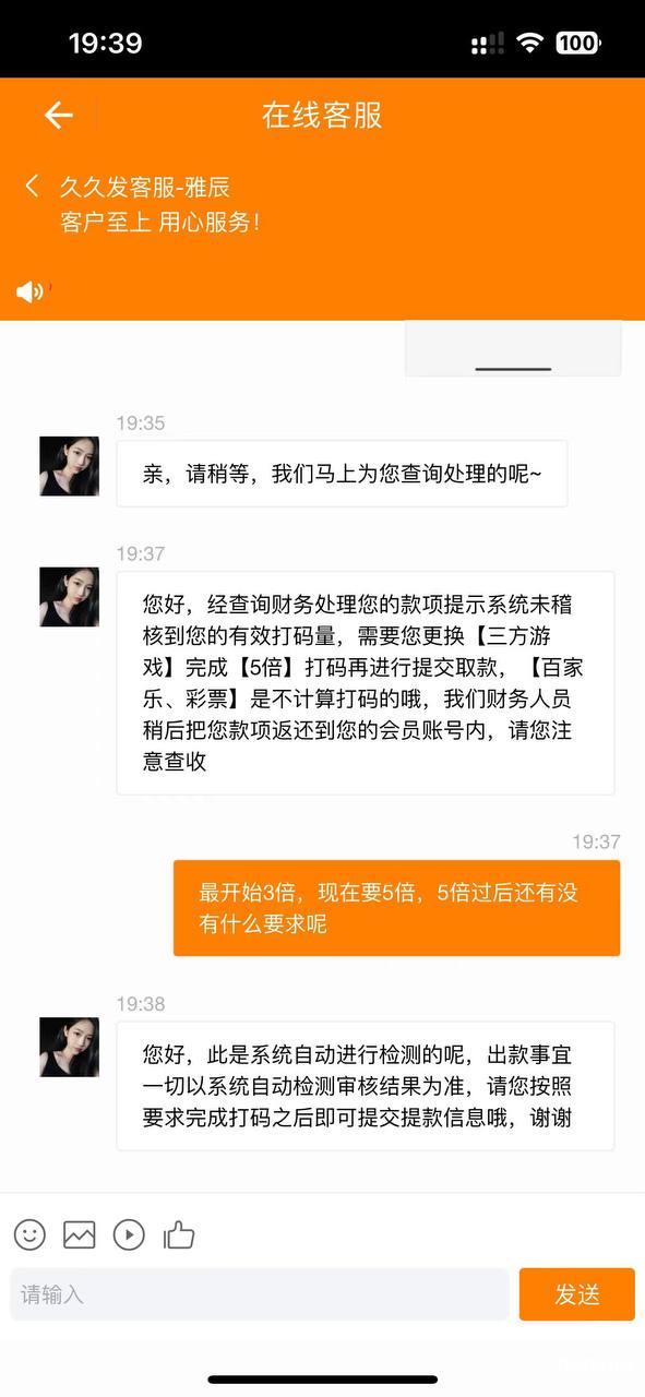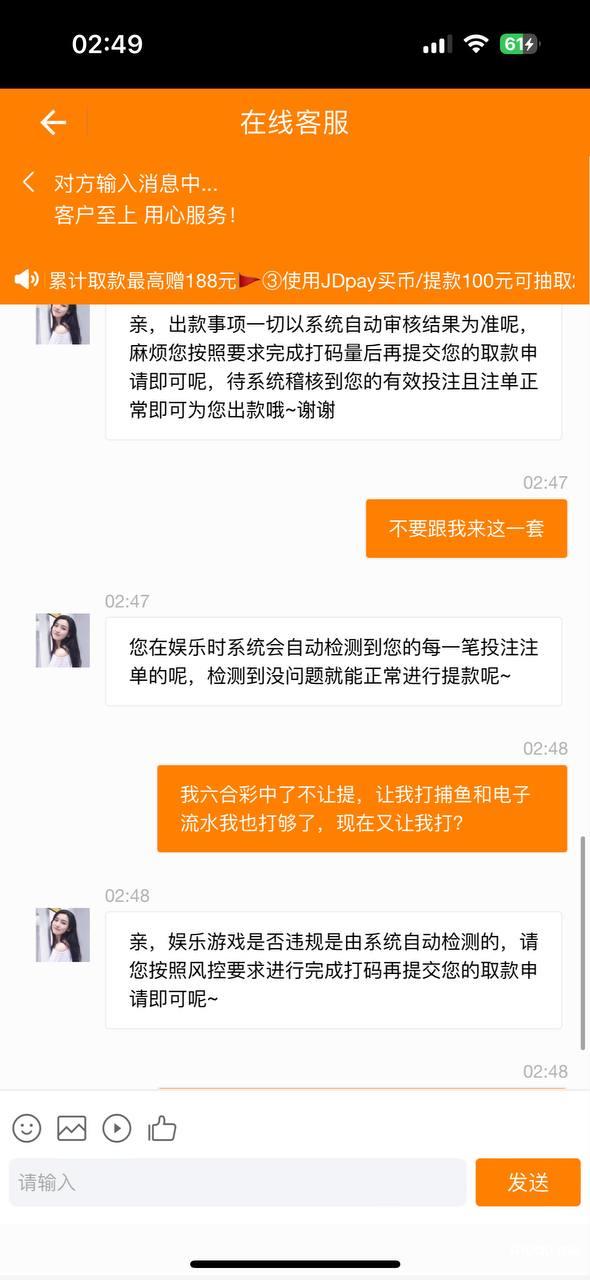 事情的经过就是周六在其平台充值然后购买了六合彩,中了15000左右,结果去提现的时候就不让提,直接退回,咨询客服,客服说流水不够,需要彩票打3倍流水,因为是老客户,就没寻思他们会搞这些,当我3倍流水完成后又说流水不够必须去捕鱼打5倍流水,当我完成后又让我去电子打5倍流水,我操你妈了个逼,这个平台是我见过最垃圾的平台,没有钱玩不起你就不要开信誉盘啊,这点钱你都黑?又不是第一天在你们平台玩,你们活不起了吗?输的只有8000块钱提款3000你也是不出,我干你奶奶个逼,他们肯定不止黑了一个会员,希望大家擦亮眼睛!